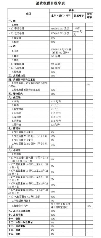在消费税税目税率表中总共涉及15类商品,包括烟、酒、高档化妆品、贵重首饰及珠宝玉石、鞭炮焰火、成品油、摩托车、小汽车、高尔夫球及球具、高档手表、游艇、木制一次性筷子、实木地板、电池和涂料。